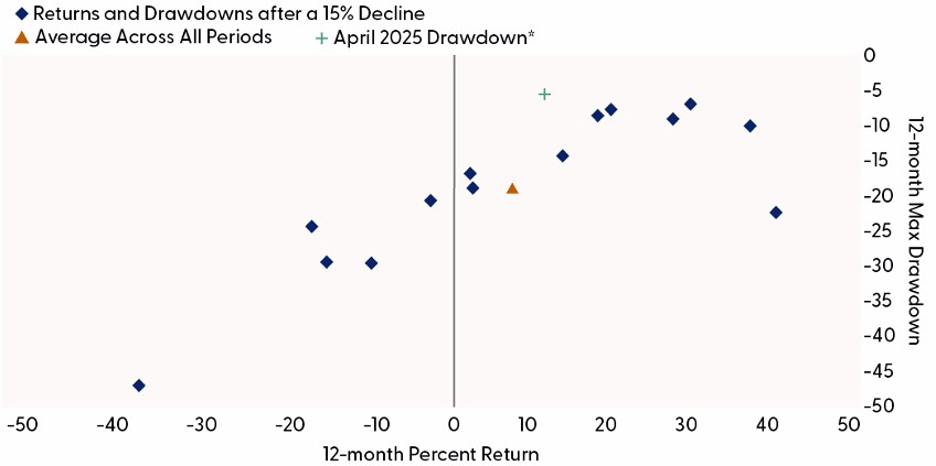 *Return from 4/4/2025 to 5/8/2025. Each period represents a unique 15% or greater drawdown from a record high. Past performance is no guarantee of future results. All indexes are unmanaged and can’t be invested in directly. The modern design of the S&P 500 stock index was first launched in 1957. Performance back to 1950 incorporates the performance of the predecessor index, the S&P 90.