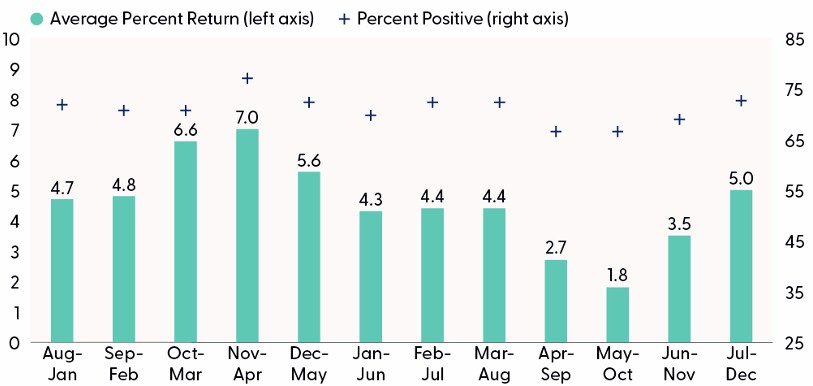 Weak seasonality could potentially complicate the broader market’s recovery as May kicks off the worst six-month stretch for the S&P 500, giving some credence to the popular “Sell in May and Go Away” seasonal strategy. This popular Wall Street saying has its roots in London, where it was originally phrased as “Sell in May and go away, come back on St. Leger’s Day.” (The St. Leger is a renowned horse race in the U.K., dating back to 1776.) The concept behind this adage is that investors should sell their stocks in May, take a break during the summer to avoid seasonal market downturns, and return to the market in November, when conditions are typically more favorable.