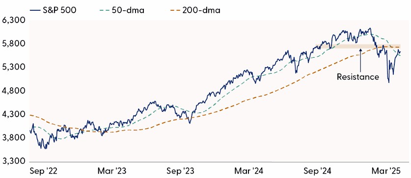 Technically, the S&P 500 has made a lot of progress after finding support near the 4,800–4,835 range. However, the bull’s biggest test lies near the approaching 200-day moving average (dma) at 5,748, an area that coincidentally overlaps near the late March highs. A breakout above this area of overhead resistance would not only raise the probability of a sustained recovery, but also potentially open the door for institutional demand entering the market via renewed interest from trend-following funds.