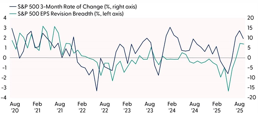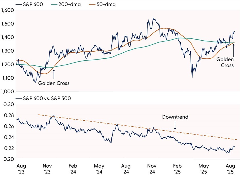 Earnings revisions are not the only thing broadening out. Last month marked an important rotation for the S&P 500 as the record-high rally expanded beyond the borders of big tech. A notable unwind of crowded positioning in high momentum and high-beta names led to flows pouring into other sectors and down market cap. For the S&P 500, this meant expanding breadth metrics and a new all-time high for the equal-weight S&P 500, a proxy for the “average” large cap stock. For small caps, new buyers emerged that drove the S&P 600 Small Cap Index up roughly 7% in August, marking its best month of outperformance over the S&P 500 in over a year.
