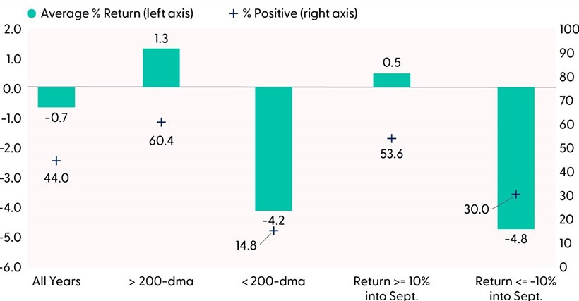 However, context is key when it comes to seasonal data, and right now, the market is trending higher and exhibiting strong momentum into September. When accounting for these factors, September hasn’t been so bad. For example, when the S&P 500 is above its 200-day moving average (dma) going into September, the average price return for the month jumps to 1.3%, with 60% of occurrences producing positive results. This compares to an average September price decline of 4.2% and positivity rate of only 15% when the index is trading below its 200-dma going into the month.