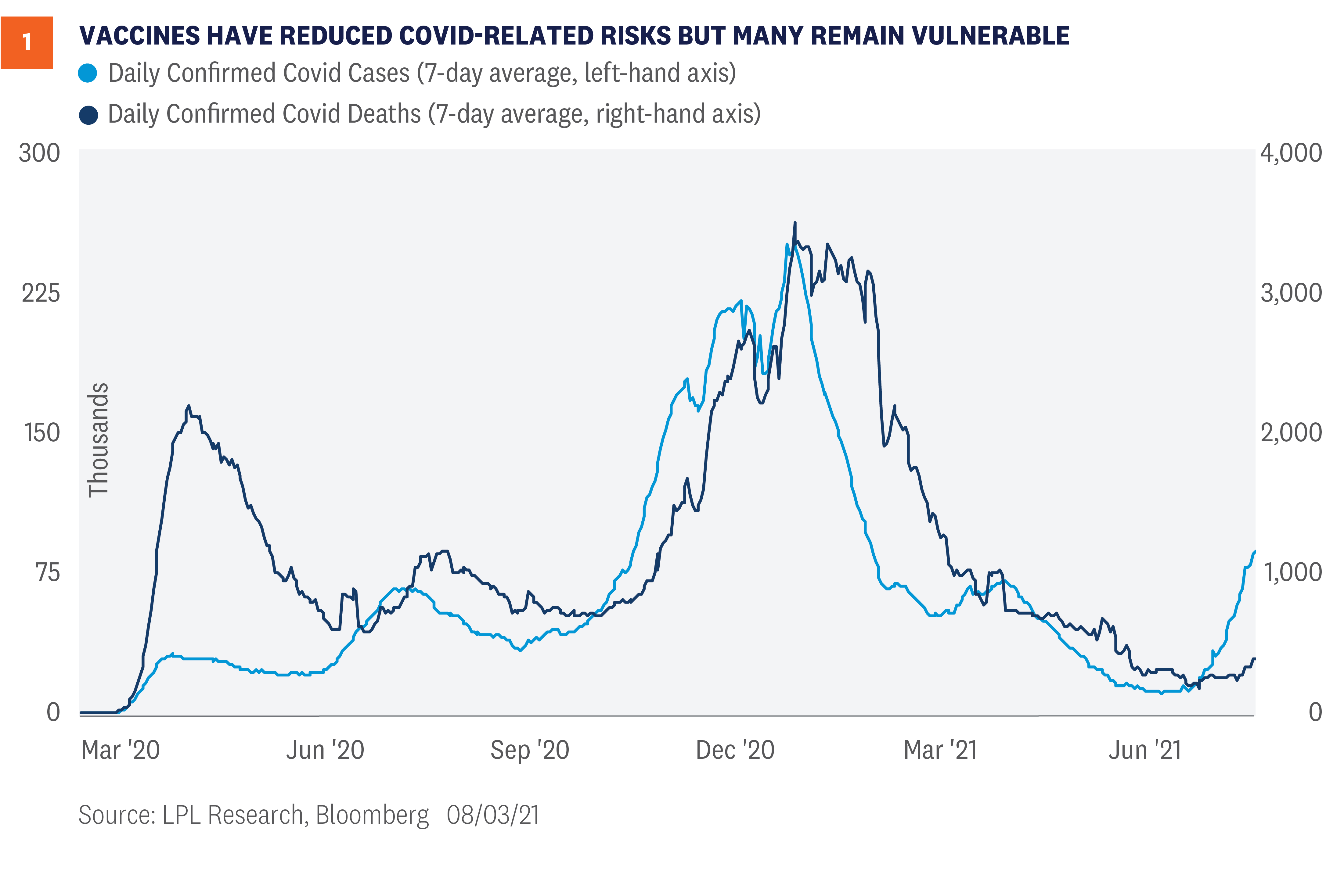 The highly transmissible Delta variant of COVID-19 now makes up an overwhelming majority of the new cases in the U.S., bringing with it a rise in cases and hospitalizations. Widespread vaccine distribution and distancing measures have helped limit the variant’s impact, but we could still see some drag on economic growth as some restrictions are reintroduced and consumers potentially become more cautious. While we may see an increase in market volatility due to the Delta variant, we believe the S&P 500 is still likely to see more gains through the end of the year.