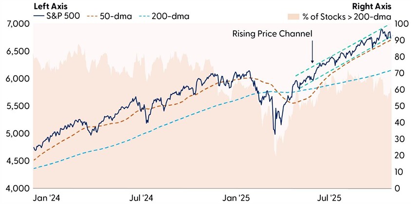 By Friday, however, buy-the-dip sentiment had resurfaced as investors stepped in at key technical support. The S&P 500 survived another retest of its 50-day moving average (dma), which coincidentally overlaps with the lower end of its rising price channel. A break below this channel would expose downside risk toward the November and October lows (6,631 and 6,550, respectively).