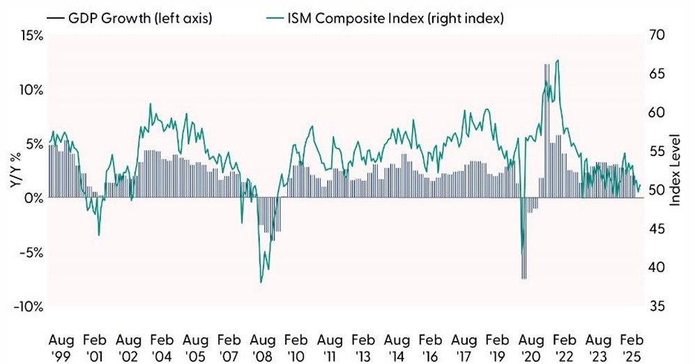 The economy will likely post a solid second quarter after the first quarter was suppressed by a surge in imports from businesses front-running tariff threats. The subsequent rebound in growth might create a perception of a strong recovery, but we think this is likely a head fake. The whiplash in trade policy is adversely impacting official economic data and creating difficulties for investors, as it becomes almost impossible to discern whether the economy is genuinely rebounding or merely experiencing short-term fluctuations. Such distortions highlight the importance of looking beyond government statistics to industry reports from the likes of the Institute for Supply Management (ISM) to form a clearer picture of economic conditions. The ISM Composite Index, which gives insights into business views from across the country in both the goods and services industries, fell in recent months and points to a broader slowdown coupled with reaccelerating inflation.