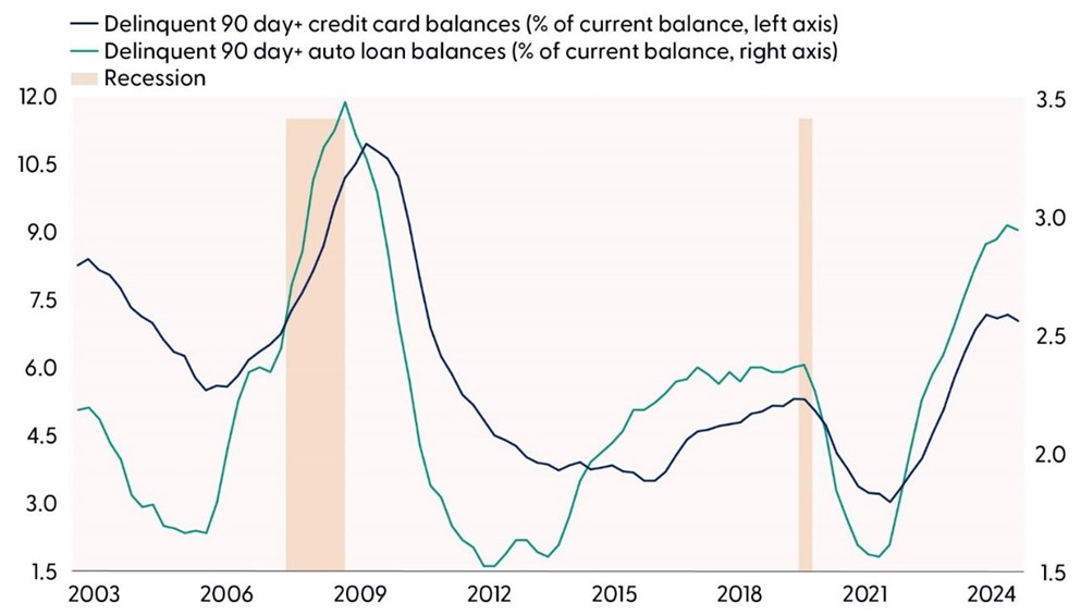 As it relates to consumer health, credit card and auto loan delinquencies are elevated relative to previous stressful periods. We think this is worth monitoring and raises a yellow flag amid the optimism of pro-business tax policy, a stable labor market, and seeming U.S. exceptionalism.