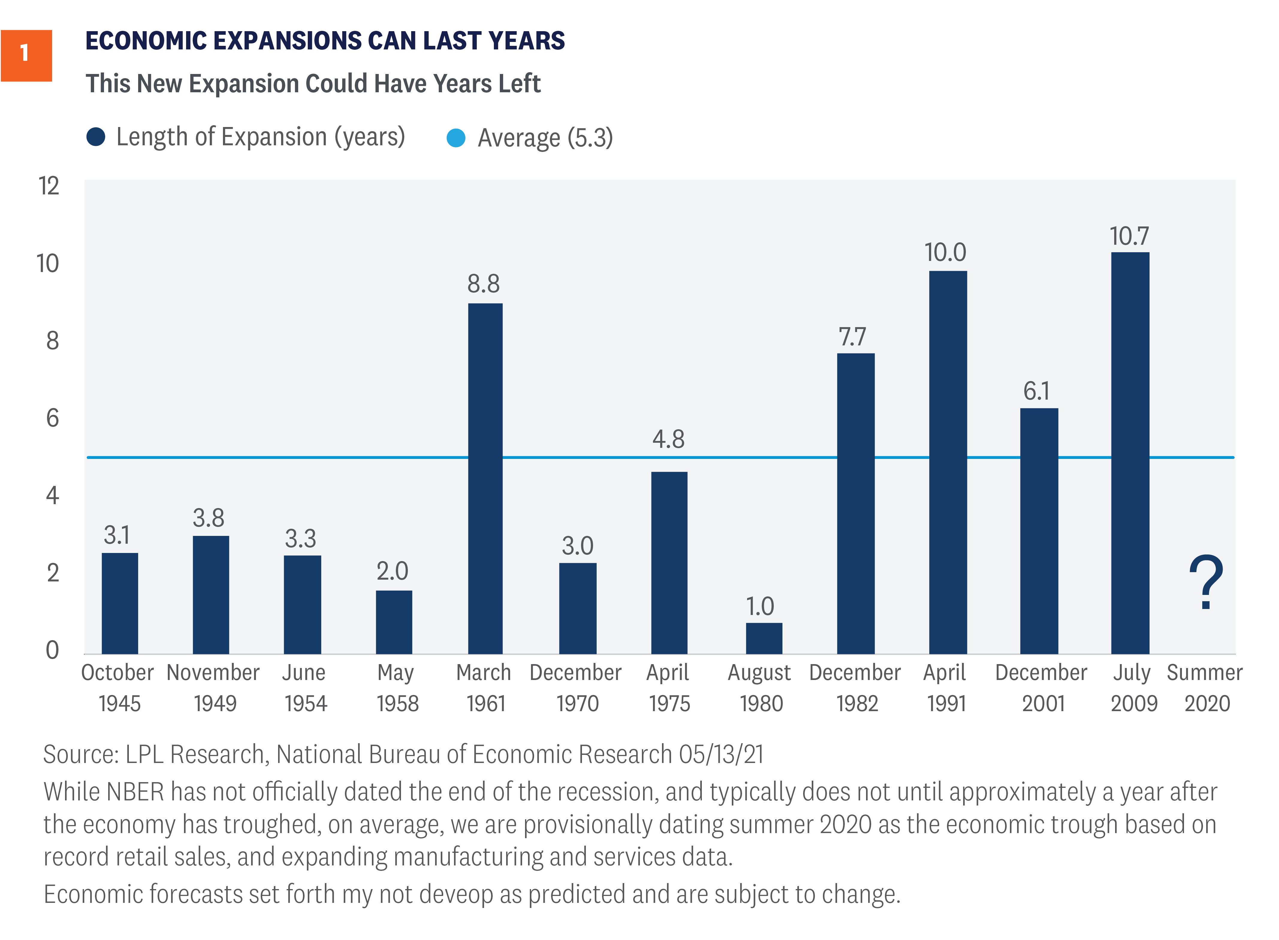 Just because economic data is peaking doesn’t mean the new expansion is over. In fact, it’s perfectly normal to see the year-over-year levels of growth peak about a year after a recession ends, and be followed by many more years of growth. As shown in [Figure 1], the average expansion has lasted more than five years, with the last four cycles all lasting longer. The last expansion was the longest ever, making it to 11 years old before COVID-19 struck, and otherwise might have gone on even longer. However, this cycle may not last as long as the last one, as this wasn’t your average recession. Because the recession last year was likely the shortest ever (besting the six-month recession in the early 1980s) and the economy was supported by historic stimulus, some imbalances weren’t worked off like we tend to see in a normal recession. Corporate debt levels remain high, supported by low interest rates, and stock valuations never really reset. The good news is this new cycle of growth has enough going for it to be at least average, and even that would mean it still has another four years of economic growth left. There’s nothing wrong with being average!