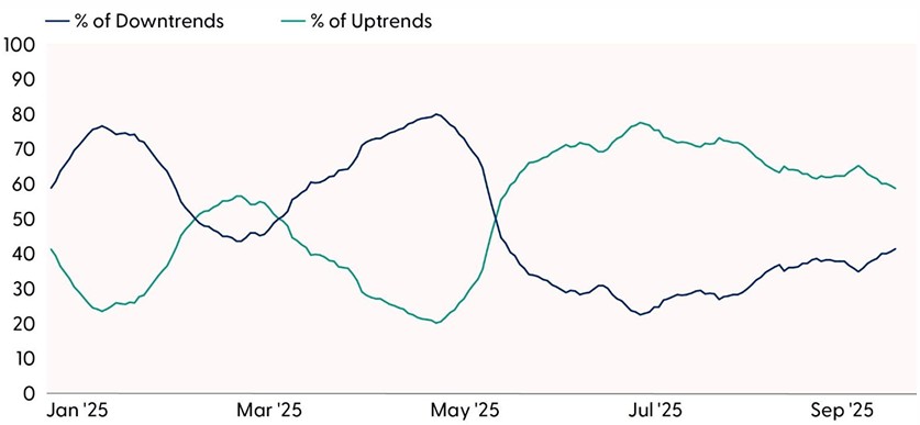 While a potential government shutdown could dampen investor sentiment, they tend to be brief and have limited impact on the broader economy or equity markets. From a technical perspective, it is hard to argue with a bull market that is making new highs and powered by cyclical leadership. However, recent overbought conditions paired with diverging market breadth suggest this melt-up could be due for some cooling off — something we would consider as a potential tactical opportunity to buy the dip, especially into a seasonally strong fourth quarter.