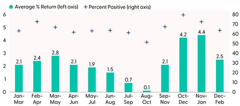 October marks the beginning of one of the best three-month periods for stocks. Since 1950, the S&P 500 has generated an average gain of 4.2% from October through December, with 80% of periods producing positive results. And when results are positive, the average gain increases to 7.0%, compared to a 6.7% decline when the three-month window is negative.