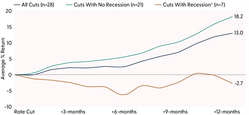 Disclosure: All indexes are unmanaged and cannot be invested in directly. Past performance is no guarantee of future results. At/Near record highs defined as periods when the S&P 500 was within 3% of an all-time high. Data based on dates from 1984-YTD. *Cuts with recession are defined as Federal Reserve interest rates occurring within six months of a recession