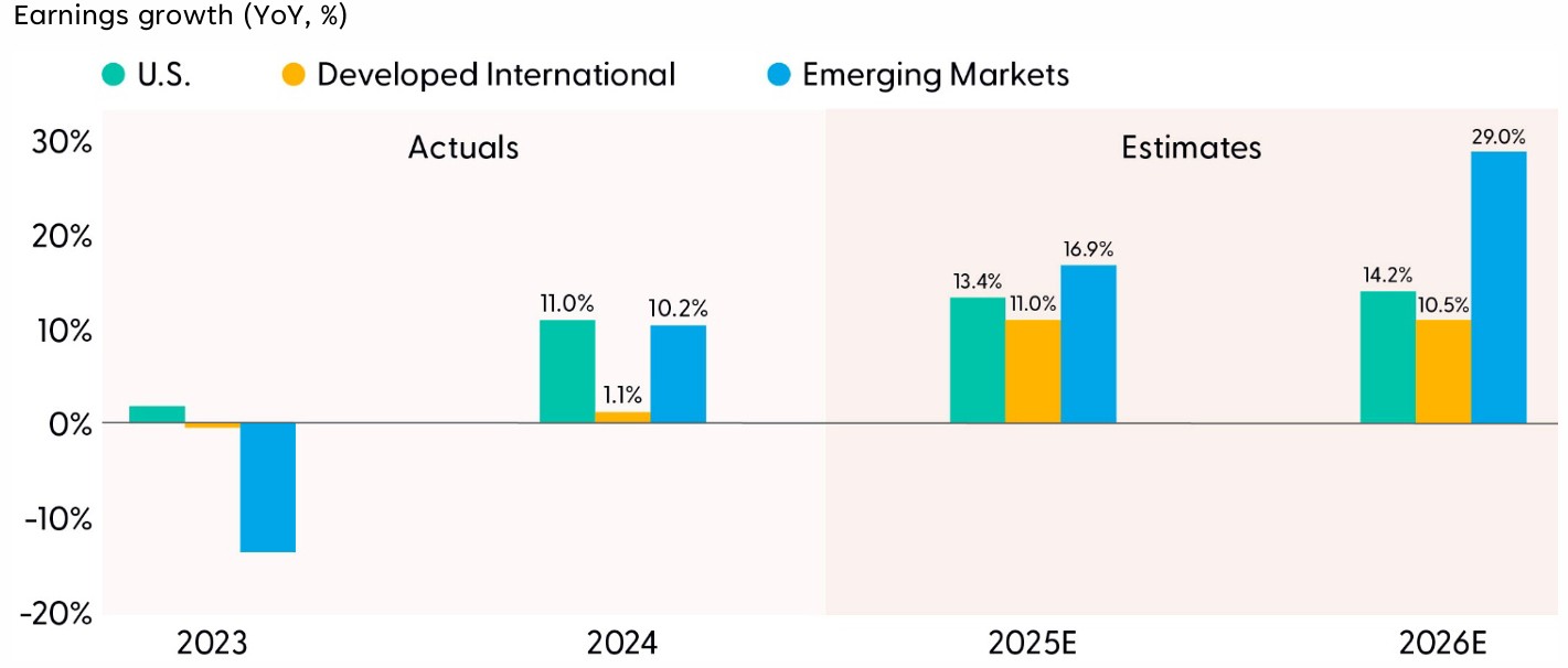 Our hesitation to jump on the EM bandwagon until our upgrade to neutral in early 2025 was centered on earnings. We would attribute much of the EM underperformance since the 2008–2009 Global Financial Crisis to earnings disappointment (though a strong U.S. dollar was another meaningful piece of the story). Year after year, EM fell short of optimistic earnings expectations. In fact, the consensus estimate for EM earnings per share (EPS) this year of around $90 is the same level as 2011, while EPS for the S&P 500 is up over 170% over the same time period.