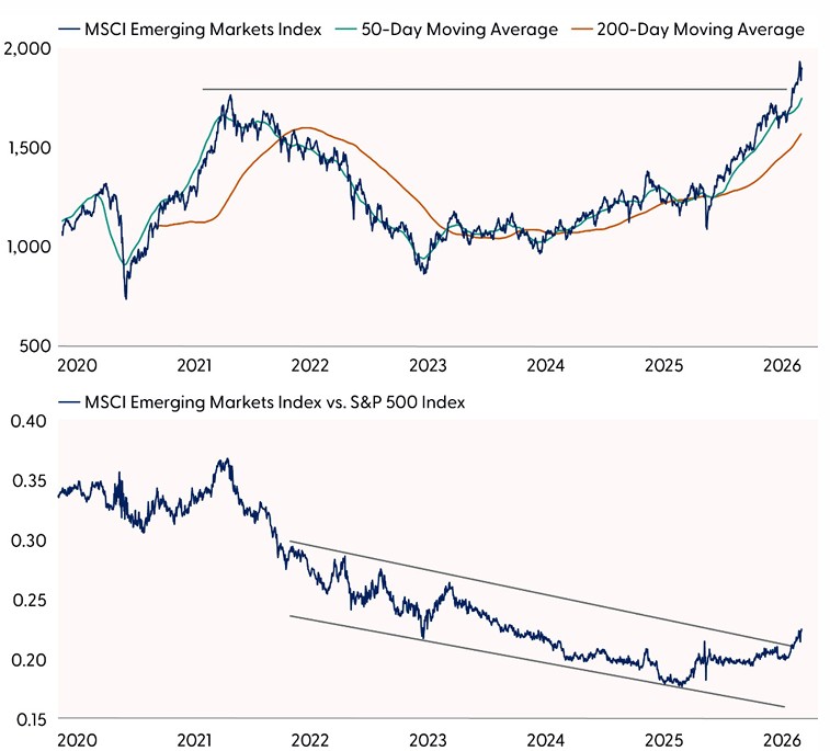 After a stellar 2025 in which emerging market (EM) equities returned 34%, 2026 is off to a good start with the MSCI EM Index up 7% year to date. Last year’s near doubling of the S&P 500 return was driven mostly by a weakening U.S. dollar, which propped up EM returns, but attractive valuations and artificial intelligence (AI) investment played a role. This week we highlight five reasons we’ve warmed up to EM.