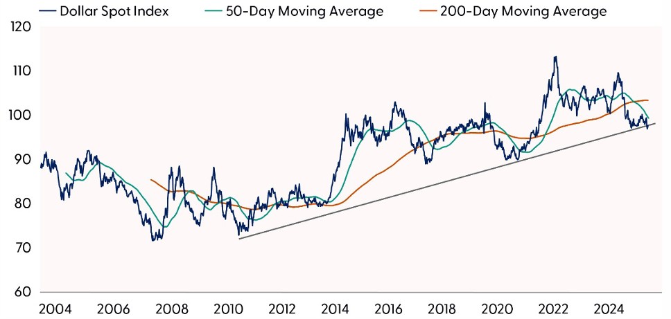Given the dollar was one of, if not the biggest drivers of EM outperformance last year, we’ll start there. The U.S. Dollar Index is on the cusp of breaking a long-term uptrend. Further weakness would potentially introduce 5% downside or more from a technical analysis perspective. Prospects for two more rate cuts from the Federal Reserve (Fed) and a Trump Administration comfortable with a weaker (but stable) dollar to help balance trade increase the likelihood of a breakdown in the currency at some point.