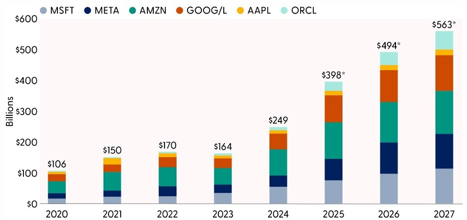 The S&P 500 is over halfway through Q3 earnings season, and results have been impressive. Of the 318 companies that have reported results, 83% have surpassed earnings per share (EPS) estimates, notably above the 10-year average beat rate of 75%, according to FactSet. Growth has been supported by strong margins, which are running close to 13% this quarter. However, most of the attention last week was on capital expenditures (capex) reported by several of the mega cap stocks. Among these names, including Alphabet (GOOG/L), Amazon (AMZN), Apple (AAPL) Meta (META), and Microsoft (MSFT), the message of more spending on artificial intelligence (AI) infrastructure was clear as they collectively spent over $100 billion on capex in Q3. This number is only going to go up, based on guidance to increase spending on AI-related investments. As highlighted in the “Capital Expenditures Surge Across Big Tech” chart, capex among many of the mega cap names is expected to jump from around $400 billion in 2025 to $563 billion by 2027.