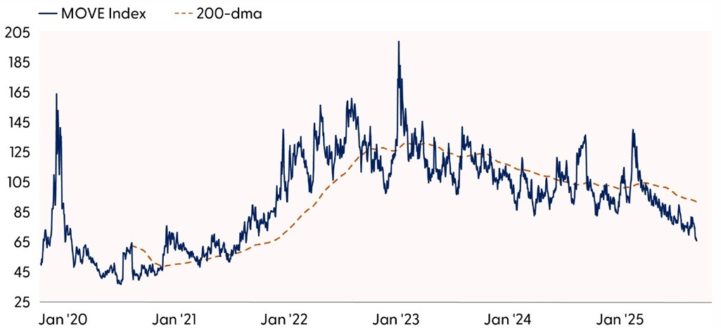 The repricing of rate cut estimates pushed yields higher across the Treasury curve. The 2-year Treasury yield, which is more sensitive to monetary policy than longer tenors, jumped around 12 basis points on the week, while 10-year Treasury yields rose around 10 basis points. Implied Treasury market volatility was more muted. The MOVE Index, a common measure of implied fixed income market volatility, with higher readings equating to higher expectations for 30-day Treasury market volatility and vice versa (like the VIX but for bonds), remained at multi-year lows last week. While the restarting of the rate-cutting cycle, limited economic data due to the shutdown, and seemingly less focus on the deficit is likely contributing to suppressed implied volatility, current levels on the MOVE Index are stretched to the downside. The MOVE Index’s current 66 reading is almost two standard deviations below its longer-term average and represents a historically low 28% discount to its 200-day moving average (dma). With volatility tending to mean-revert, an uptick in implied Treasury market volatility from here shouldn’t come as a surprise.