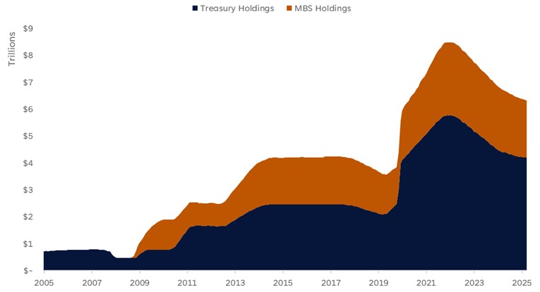 The balance sheet normalization process follows a carefully choreographed exit strategy. As reserve balances continue declining toward levels the Fed judges consistent with ample reserves, policymakers will eventually halt the runoff entirely and return to modest asset purchases designed to accommodate long-term growth in currency demand and bank reserves. This transition marks the difference between the current period of quantitative tightening and the future steady state where the Fed maintains a smaller but still substantial balance sheet. The timing of this shift depends on evolving reserve demand and funding market conditions, with Fed officials monitoring money market indicators for signs that reserves are approaching scarce levels that could impair monetary policy transmission. Given current conditions, we expect the Fed to continue to shrink its balance sheet throughout 2025, absent an unforeseen disruption in the short-term funding markets.