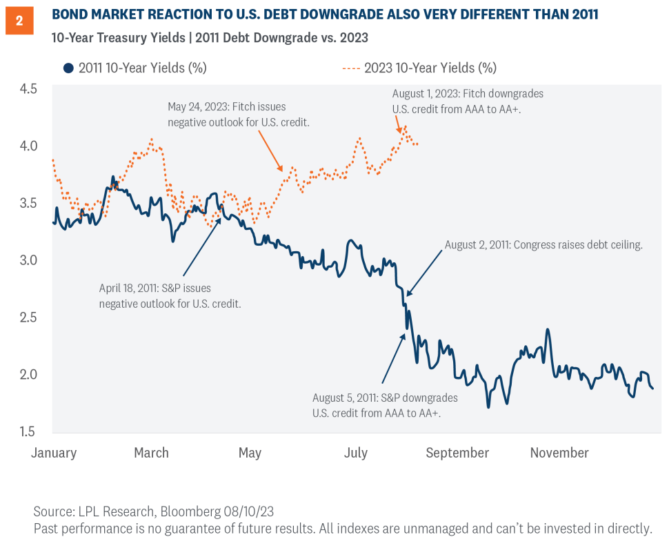 Understandably, some investors got nervous this time with the Fitch news that markets might repeat that 2011 descent. While it’s dangerous in this business to think it’s different this time, below we discuss why it is. Not only that, the market reaction has been much more subdued since the announcement—the S&P 500 fell about 2% during the three days following the news when many were calling for a pullback before the Fitch move.