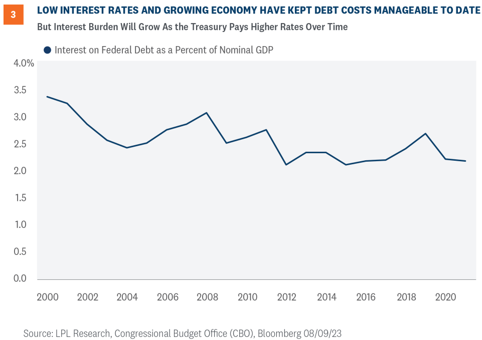Another primary concern is the potential rise in interest rates that would be required to attract buyers, including foreign buyers, into the U.S. Treasury market to help service the country’s debt. The U.S. has been fortunate that low interest rates have keep interest costs manageable in recent years (Figure 3), but this luck may run out. Interest costs to the federal government were just 2.3% of nominal GDP in the latest quarter, below levels observed in recent decades. Note that Treasury Secretary Janet Yellen has referenced 3% as a dangerous number in the past.