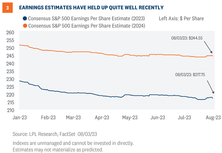 Quantitatively, we can see below that estimates have stabilized in recent weeks. The consensus S&P 500 EPS estimate has impressively held steady since April and remains near $218 per share (Figure 3). Relatively upbeat guidance has increased the chances that earnings grow in Q3 and end the earnings recession, and even pushed up estimates for Q1 2024.