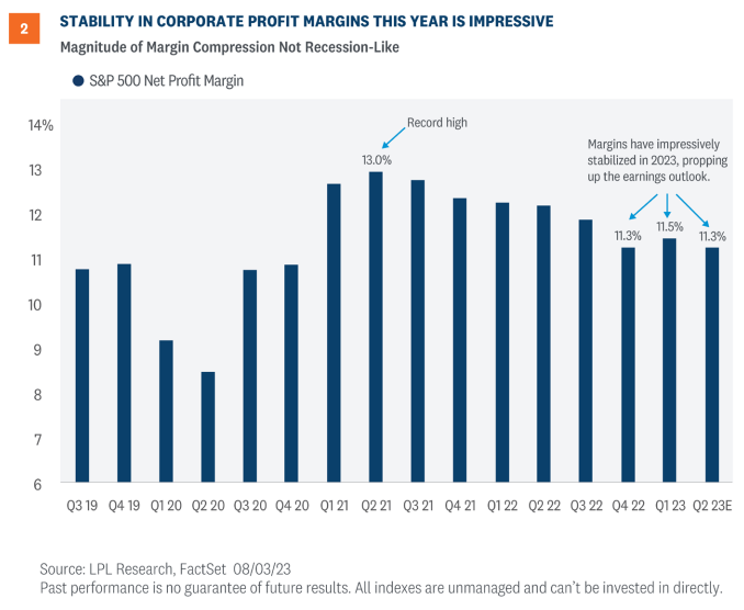 As we noted in the Midyear Outlook 2023: The Path Toward Stability released mid-July, weexpect S&P 500 earnings to decline slightly this year. But analysts have continued to underestimate corporate America’s profit potential, and the economy continues to outperform most expectations.