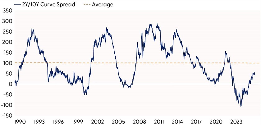 That said, we don’t think now is a good time to overweight duration (interest rate sensitivity) in fixed income portfolios. A neutral duration relative to benchmarks is, in our view, still appropriate. And for those investors that want to own bonds for income, as mentioned in our 2025 Outlook, the opportunity for income remains robust with the belly of the curve (out to five years) remaining attractive.