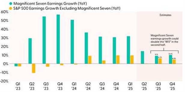 If stocks are going to go meaningfully higher from here in the second half of 2025, earnings will be an important part of the story. And you can’t talk about the earnings outlook without the two “T”s: tariffs and technology. Starting with tariffs, earnings growth in the first quarter for S&P 500 companies was solid at around 13%, with nearly half of that increase coming from big tech companies — the so-called Magnificent (Mag) Seven. Normally, investors would celebrate these numbers, but they were produced before most of the tariffs went into effect, which clouds the outlook.