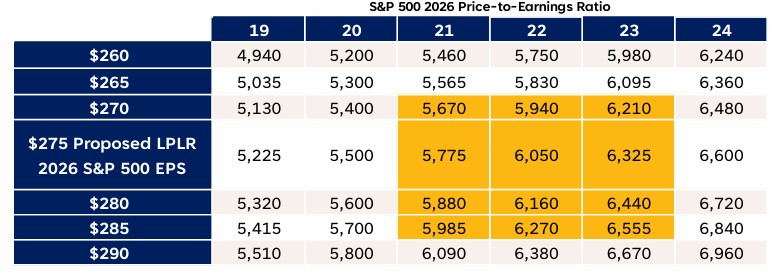 The numbers in the accompanying table illustrate a range of potential fair value S&P 500 targets based on what LPL Research believes are the most likely paths for the key drivers of earnings over the next 18 months and the potential economic and policy backdrop. A “blue-sky” bull case scenario could put the index potentially at 6,450 at year end, based on a P/E of 23 times and $280 in S&P 500 EPS for 2026. Rapid adoption of AI undoubtedly carries the potential to drive double-digit earnings growth in 2026.