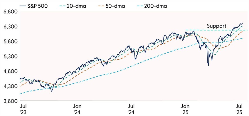 Volatility came back on cue last week as the S&P 500 fell close to 2% on Friday, ending a 32-trading-day streak without a 1% decline. Selling pressure was widespread and dragged the index back below its 20-day moving average (dma), an area that has been a consistent area of dynamic support over the last few months. This leaves the 6,200 area as the next area of support for the broader market, followed by February highs at 6,144. Breadth measures are holding up relatively well, with over 50% of S&P 500 stocks holding up above their 200-dma on Friday, while the majority of index constituents remain in uptrends.