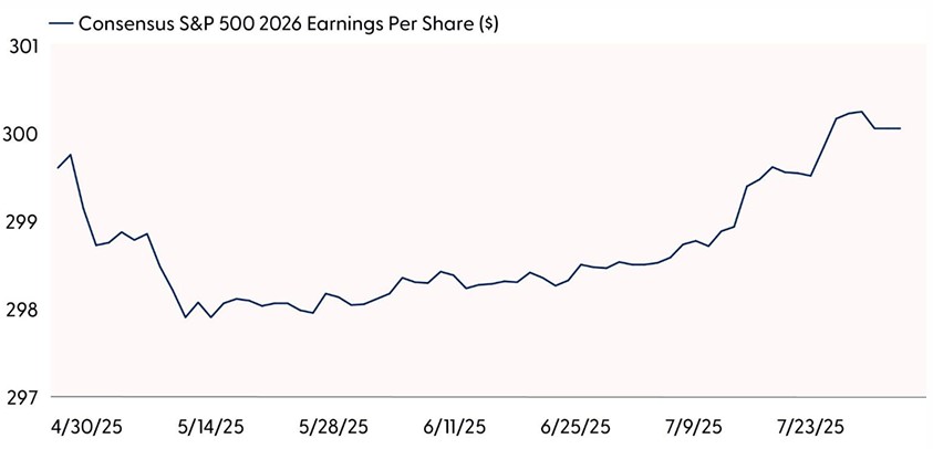 When earnings season began, the consensus S&P 500 earnings per share (EPS) estimate called for a 4–5% year-over year increase. We had expected some upside, potentially to 7–8%, as tariffs began to weigh on profit margins. Well, with about two-thirds of S&P 500 companies having reported results, the index is tracking to a more than 10% increase in earnings (source: FactSet).