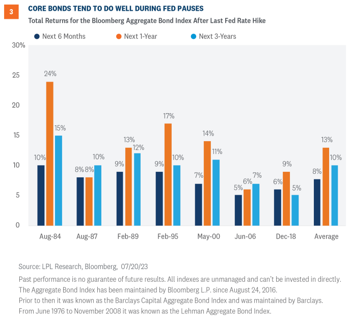 LPL’s Strategic and Tactical Asset Allocation Committee (STAAC) recommends a neutral tactical allocation to equities, with a modest overweight to fixed income funded from cash. The risk-reward trade-off between stocks and bonds looks relatively balanced to us, with core bonds providing a yield advantage over cash. A Fed pause has historically been a positive for core bond investors.