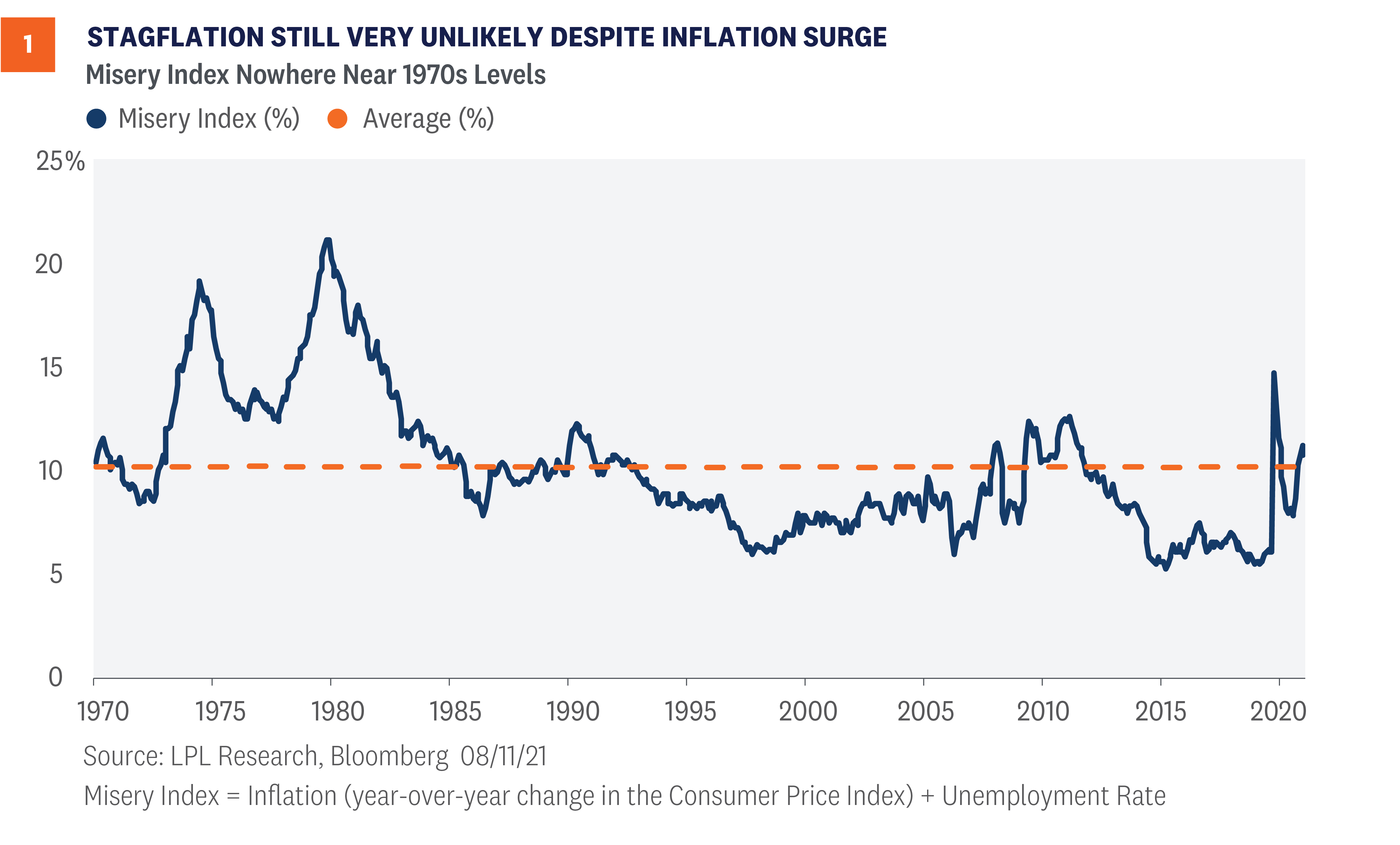 One way to gauge stagflation is to calculate what is commonly referred to as the Misery Index—inflation plus unemployment. As shown in [Figure 1], the Misery Index today is nowhere near the extreme levels of the 1970s. In fact, the level of “misery” is very close to the long-term average near 10—despite the highest inflation readings we’ve seen in over a decade.