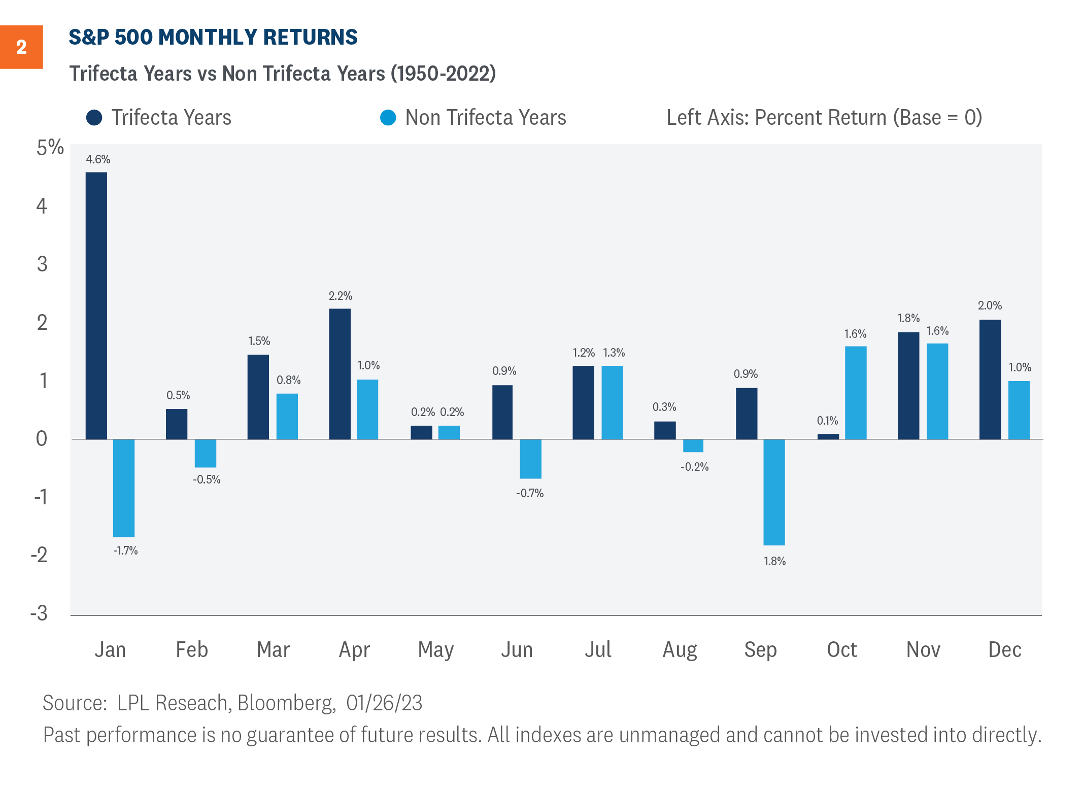 Finally, we also compared the monthly seasonality for trifecta years and non-trifecta years. Figure 2 highlights the returns across each scenario. While the strong January average returns during trifecta years decelerate in February, they do not historically turn negative. In fact, of the 31 trifecta years observed, all 12 months produced positive average monthly returns.